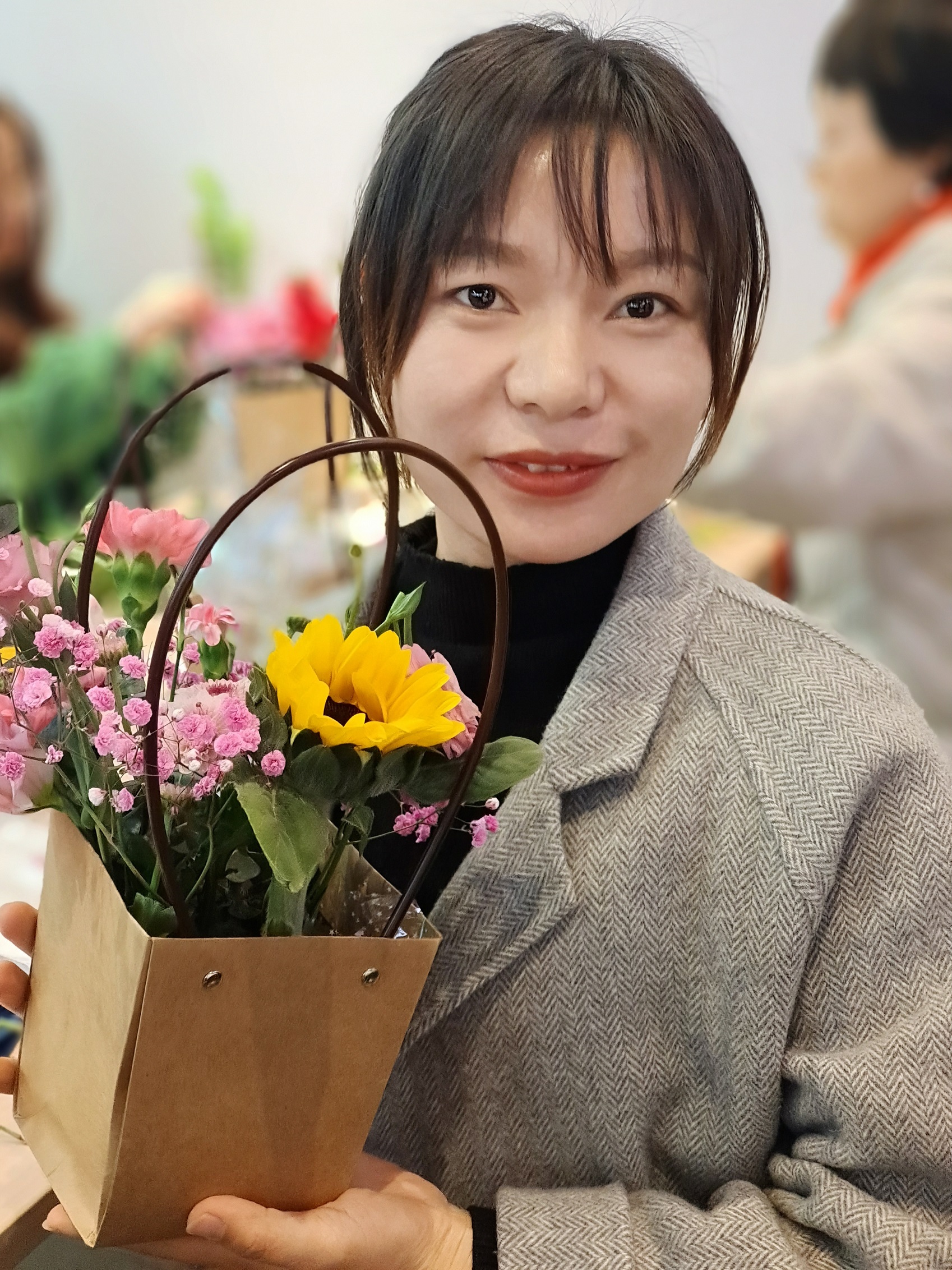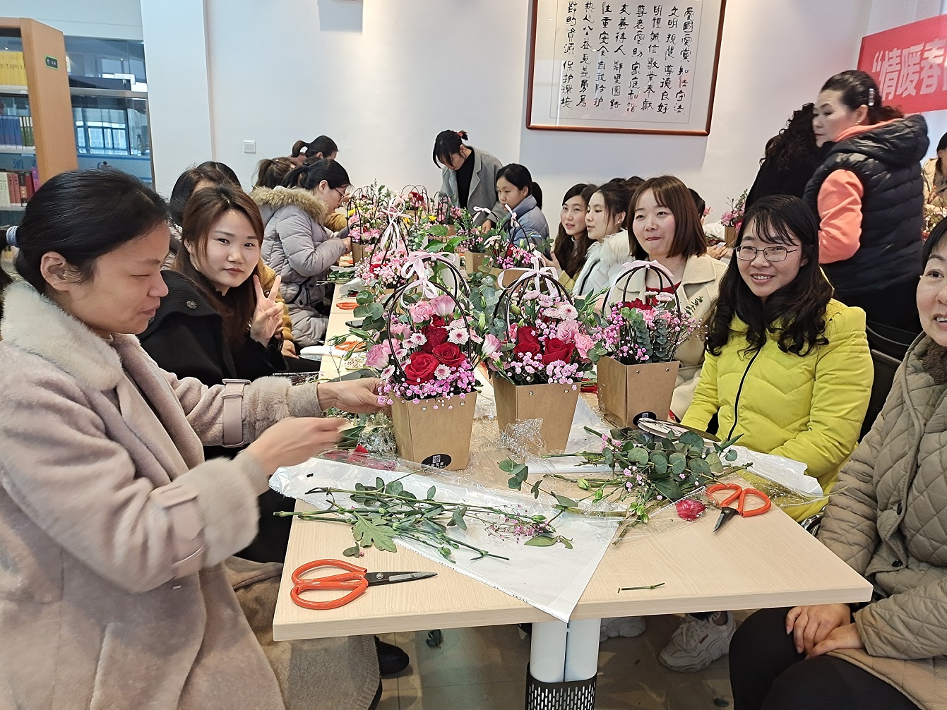“選取一朵你最喜歡的康乃馨,剪掉部分花桿,留下15到20公分的花桿,把它插在花泥的最中間……”王老師為大家詳細講解了花材的識別、搭配以及插花的技巧等方面知識,并現(xiàn)場進行了插花展示,看到老師精美的作品之后,大家興趣盎然,躍躍欲試,發(fā)揮各自想象力和創(chuàng)造力,將玫瑰、康乃馨、向日葵、洋桔梗等各色花卉修剪、整枝,根據(jù)自己的喜好搭配在一起。