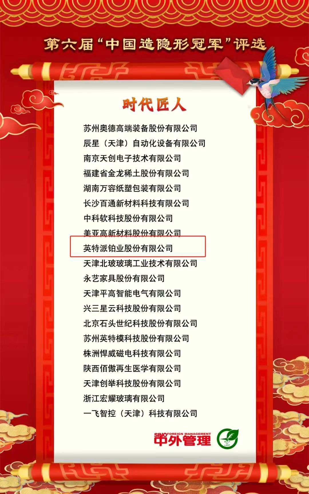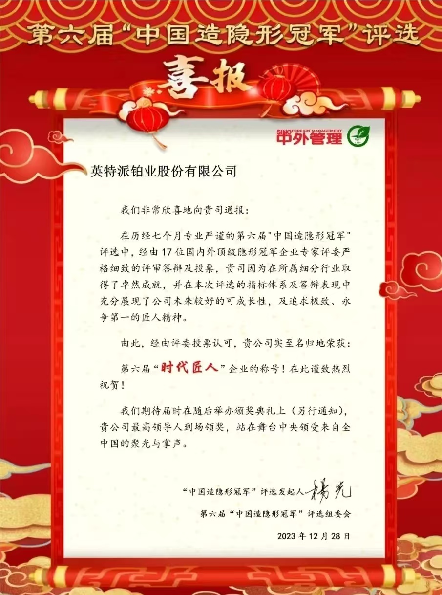 12月19日,第六屆“中國造隱形冠軍”長青懇談會在重慶盛大召開。“中國造隱形冠軍”與國家級專精特新“小巨人”彼此呼應、相輔相成,是專精特新“小巨人”企業中的塔尖群體。在本次評選中,英特派鉑業股份有限公司榮獲“時代匠人”稱號。